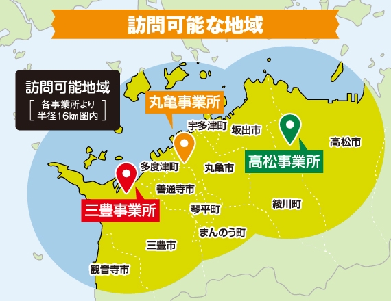 訪問可能な地域 訪問可能な地域は、訪問マッサージ こころから直線距離で半径16kmの範囲となります。 丸亀市 坂出市 善通寺市 仲多度郡 綾歌郡 高松市 三豊市 観音寺市 詳細は、お問い合わせください。 >>お問い合わせフォームはこちら