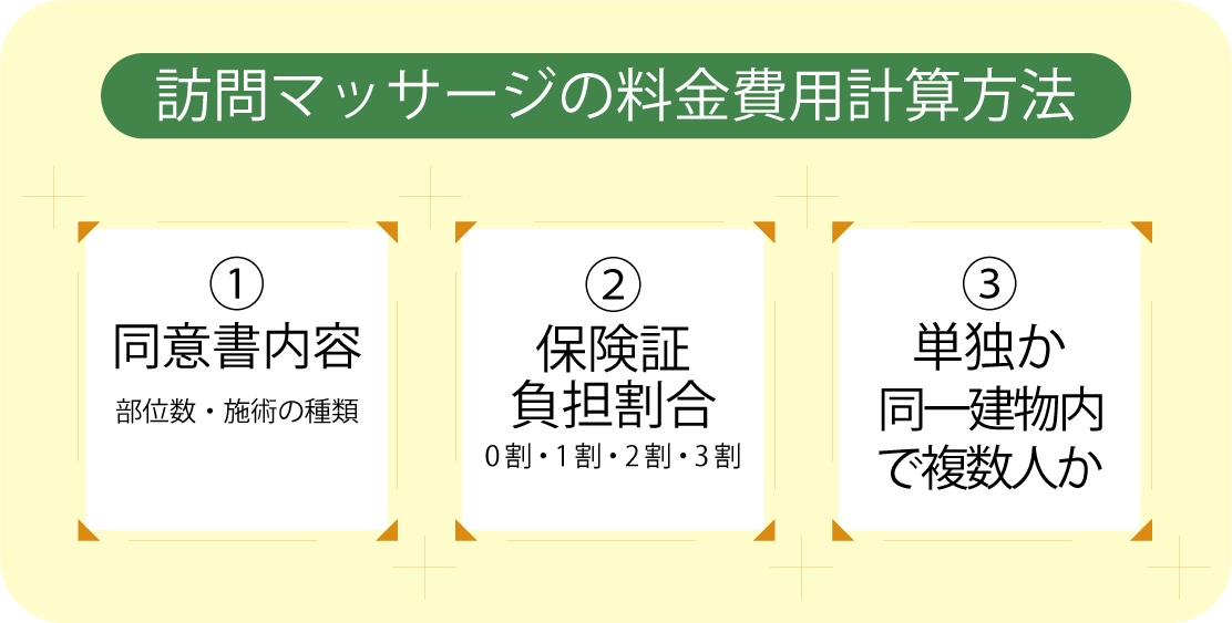 - 訪問マッサージの費用は、厚生労働省により定められており一律です。